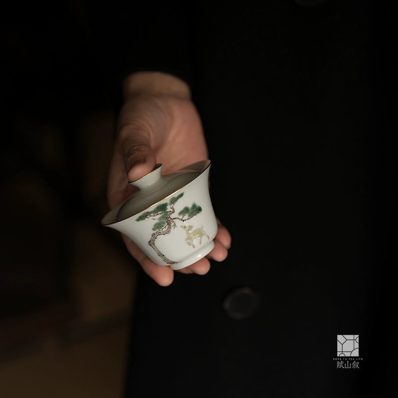 [賦山敘 x Gohobi] Hand-Painted Pine & Deer Gaiwan – Antique Style Ceramic Gongfu Tea Bowl for Rock Tea Brewing