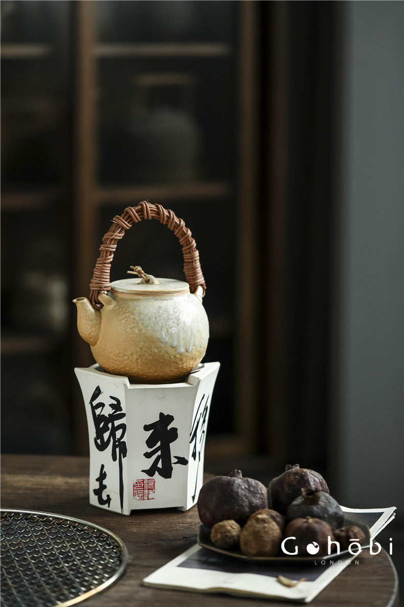 This teapot is heat-resistant and suitable for electric ceramic stoves and controlled open flame. Please avoid sudden temperature changes and heat gradually to preserve the clay body.