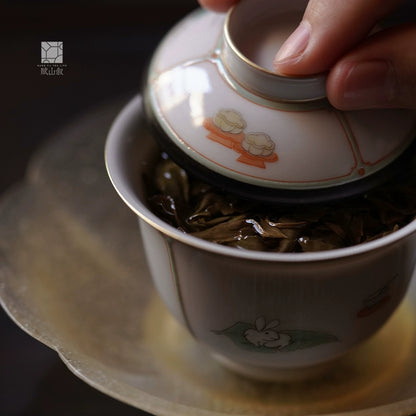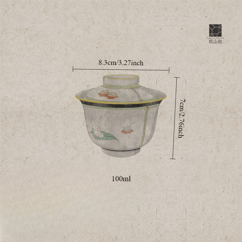 This small hand-painted gaiwan features the serene “Garden Offering” (庭芜清供) motif, blending classical still-life imagery with a calming green glaze and a distinctive ink-toned rim. Ideal for Gongfu brewing, especially rock tea (Yancha), it offers a refined tea experience in both form and function.