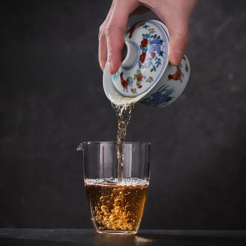 Experience the elegance of traditional Chinese tea culture with this Jingdezhen official ceramic hand-painted Chicken Gaiwan and Cup Set. Crafted with meticulous artistry, each piece showcases delicate hand-painted chicken motifs, symbolizing prosperity and vitality. The fine ceramic ensures excellent heat retention and a smooth pour, enhancing your tea ritual with both beauty and functionality. Perfect for connoisseurs seeking a refined and authentic tea experience.