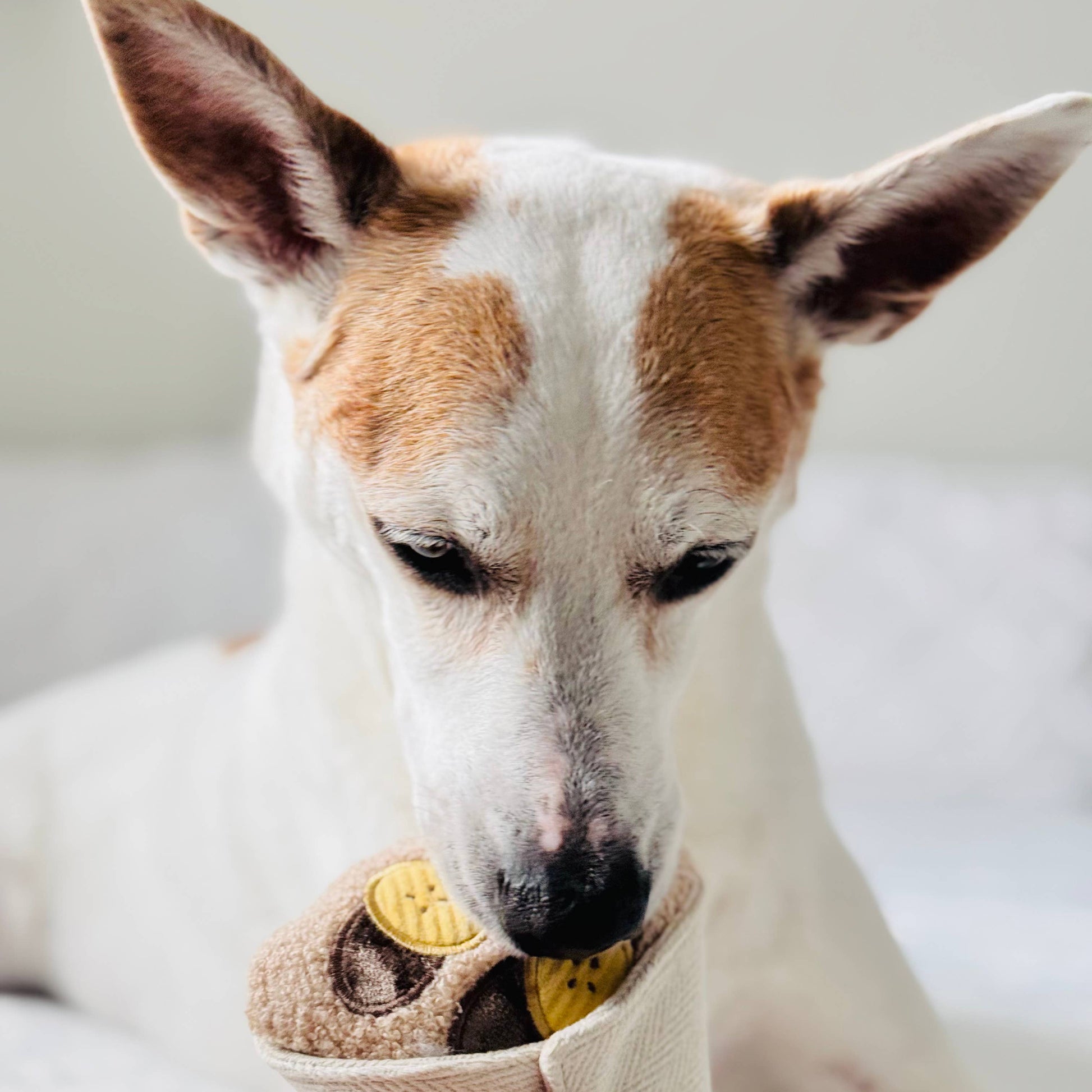 Treat your furry friend to a delightful playtime with our snuffle + squeaky Crepe! 🥞🐾 This adorable toy mimics a delicious crepe, complete with a clever slot for hiding treats between the crepe and its textured paper packaging. Your pup will love the challenge of sniffing out their hidden goodies!